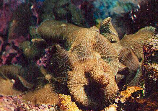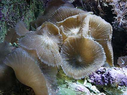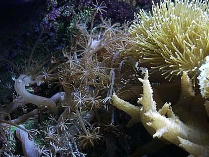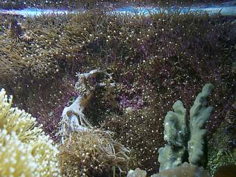 Im obersten Bild sind zwei winzige pilzartige Lederkorallen zu entdecken - sind jetzt (erstes Bild) zu fast 30 Zentimeter Durchmesser herangewachsen! Im zweiten Bild sieht man einige der etwa 200 Polypen der braunen pumpenden Xenia, im dritten Bild sieht man die zum grossen Teil mit hunerten Polypen mit Röhrenkoralle bewachsenen Rückwand, im vierten Bild sieht man die beiden Pilzlederkorallen von oben, fünftes Bild: grüne Scheibenanemonen, sechstes Bild braune Scheibenanemonen, unter den Pilzlederkorallen sind die Krustenanemonen, im Bild eins sieht man rechts eine runde Steinkoralle ...