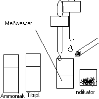 Was braucht man dazu: Ammoniaklösung ca. 25 Prozent (ca 0,1 Liter), Indikator-Puffertabletten zur Härtebestimmung mit Titriplex-Lösungen (davon werden einige Tabletten zerrieben, das Pulver wird später verwendet), destilliertes Wasser sowie Titriplexlösung A zur Härtebestimmung (man bekommt sog. Titrisol- ein in Kunststoff eingehüllte genaue Lösung, die mit destilliertem Wasser auf ein Liter aufgefüllt wird... so hat man die Grundlösung, die später noch nach Berechnung weiterverdünnt wird), ein Meßgläschen (auch Kunststoff) mit 5 ml - Marke, Tropffläschchen mit Pipette. Die Titriplexlösung kann man auch günstig selber herstellen.