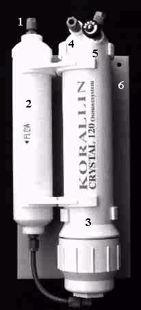 Die Osmoseanlage KORALLIN CRYSTAL 120 wird in einem Karton komplett mit Vorfilter -2- (Sedimentfilter), dem eigentlichen Membranfilter -3- , dem Spülventil mit Abwasserschlauch -5- , dem Reinwasser- (Osmosewasser-) Anschluß -4- und -Schlauch und dem Anschluß und Schlauch für die Wasserzufuhr -1- samt Perlatoranschluß (Direkt an fast jeden Wasserhahn anschließbares Schraubstück - Bild 2k). Die Einheit ist auf einer Kunststoffgrundplatte -6- untergebracht, wobei alle Filterteile auch ohne Zerlegung aus den Halterungen genommen werden können. Extra ist noch ein Kohlefilter (bei höherem Chlorgehalt sinnvoll) erhältlich. Die Schläuche und der Perlatoranschluß sind auf dem Bild nicht abgebildet.