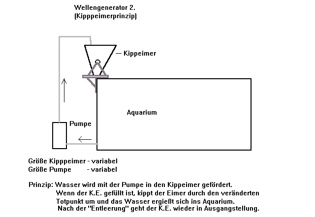 Alternativ bastelt da so jeder Aquarianer an allen möglichen Selbstbausystemen.Manche benutzen dabei eine "große" Pumpe(5000ltr. und mehr) die dezentral im Unterschrank untergebracht ist und über ein Rohrnetz aus GF Rohr mit unterschiedlichen Ausströmpunkten im Aquarium zurückgeführt wird. Dieses Rohrnetz ist dann ausgerüstet mit Stellmotoren und Magnetventilen um unterschiedliche Strömungen zu erzeugen. Interessant wird es dann bei Großanlagen über 10.000 ltr. da ist es dann schwierig die Strömung mit Pumpen zu erzeugen. Diese Anlagen haben dann einen abgegrenzten Bereich, in dem dann mit allen möglichen Mittel (Paddel oder Kolbenzylinder) "Wellenschlag" simuliert wird.