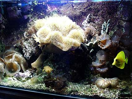 Im obersten Bild sind zwei winzige pilzartige Lederkorallen zu entdecken - sind jetzt (erstes Bild) zu fast 30 Zentimeter Durchmesser herangewachsen! Im zweiten Bild sieht man einige der etwa 200 Polypen der braunen pumpenden Xenia, im dritten Bild sieht man die zum grossen Teil mit hunerten Polypen mit Röhrenkoralle bewachsenen Rückwand, im vierten Bild sieht man die beiden Pilzlederkorallen von oben, fünftes Bild: grüne Scheibenanemonen, sechstes Bild braune Scheibenanemonen, unter den Pilzlederkorallen sind die Krustenanemonen, im Bild eins sieht man rechts eine runde Steinkoralle ...